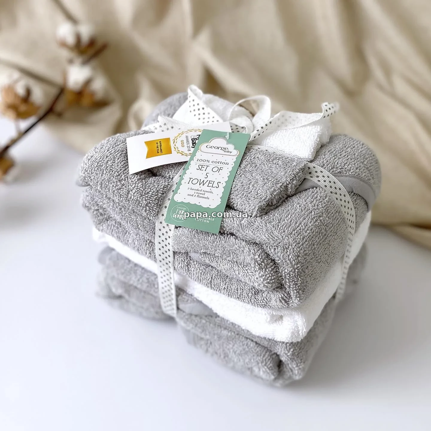 Детский набор полотенец George с капюшоном включает все необходимое для дома и поездок: два серых полотенца с уголком размером 75х75 см, одно белое полотенце без уголка того же размера и две махровые салфетки 20х20 см. Полотенца с уголком удобно использовать сразу после ванны, аккуратно укутывая малыша, а салфетки подойдут для умывания или кормления.