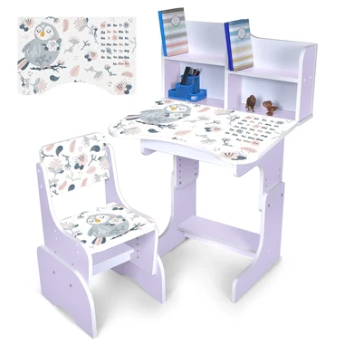 Детская парта N 2071-10-6 имеет продуманную конструкцию, для тетрадок и книг предусмотрены удобные полочки, а под столешницей расположен вместительный ящик для канцелярии и мелочей. Гладкая столешница с моющейся поверхностью практична в уходе, а изображение украинского алфавита и стильный рисунок с птичкой делают процесс обучения более интересным и наглядным.