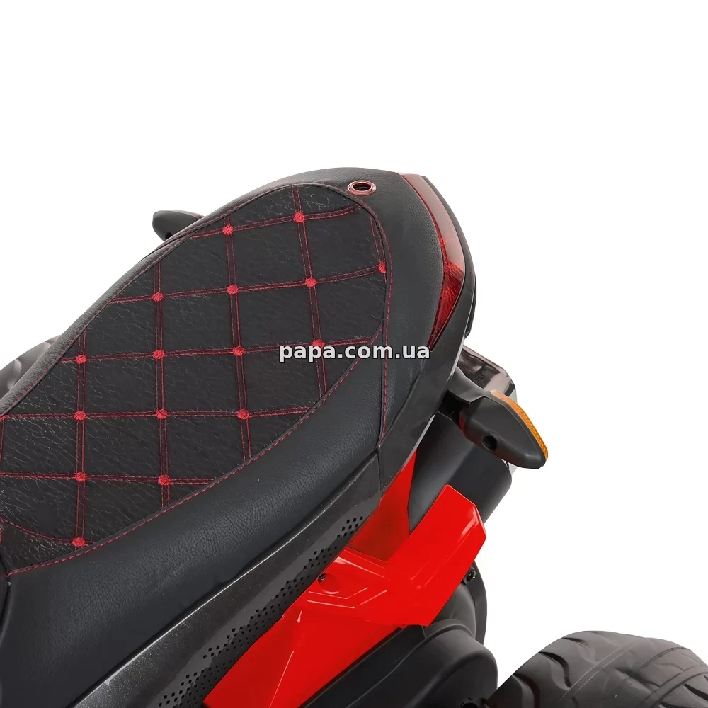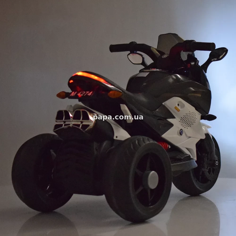 Детский мотоцикл M 4274EL-3 оснащен тремя колесами, что делает его еще более устойчивым и позволяет малышу уверенно держать равновесие даже во время первых попыток вождения, а два двигателя обеспечивают хорошую тягу и плавный разгон без рывков.