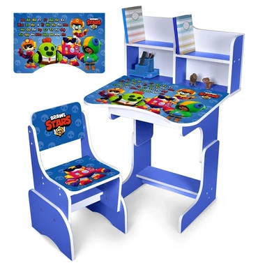 Детская парта N 2071-12-4 - выделяется стильным дизайном и яркой столешницей, на которой изображен украинский алфавит и персонажи из игры Brawl Stars, создавая атмосферу радости и вдохновения для ребенка во время занятий. Она идеально впишется в интерьер детской комнаты, добавив ей ярких красок и индивидуальности.