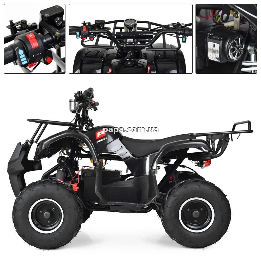 Квадроцикл Prof1 отличается прочной конструкцией и высокой надежностью, ведь его основой служит крепкая металлическая рама, которая обеспечивает устойчивость и долговечность, а корпус выполнен из прочного пластика, хорошо защищающего основные элементы техники. А если вы хотите купить квадроцикл HB-EATV1000D(MP3)-2-5, то в нашем интернет-магазине вы сможете это сделать по максимально доступной цене.