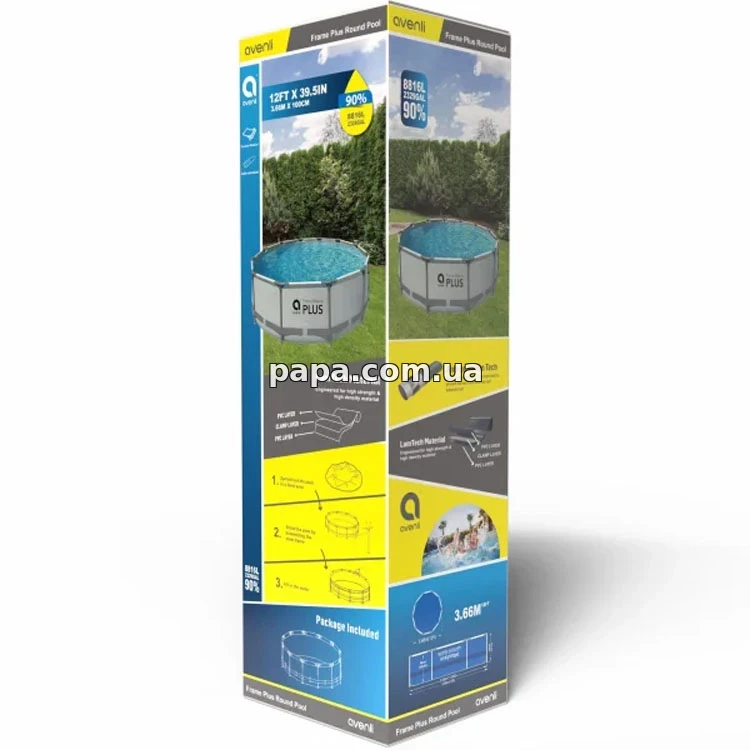 Каркасный бассейн Avenli 12336V63 - сочетает в себе высокое качество, надежность и практичность, благодаря продуманной конструкции он легко собирается и не требует сложного ухода, а прочная чаша из трехслойного винила ультра-премиального класса выдерживает активное использование, не теряя своей формы и внешнего вида даже при регулярных нагрузках.