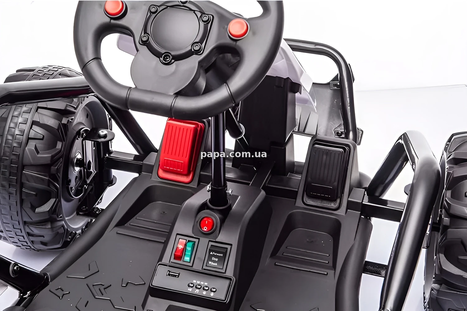 Детский электрокарт M 6374EL-4(24V) оснащен двумя мощными моторами по 200W каждый, благодаря чему он уверенно разгоняется и легко справляется с нагрузкой, обеспечивая стабильную и плавную езду, а емкий аккумулятор большой мощности позволяет кататься дольше без необходимости частой подзарядки.