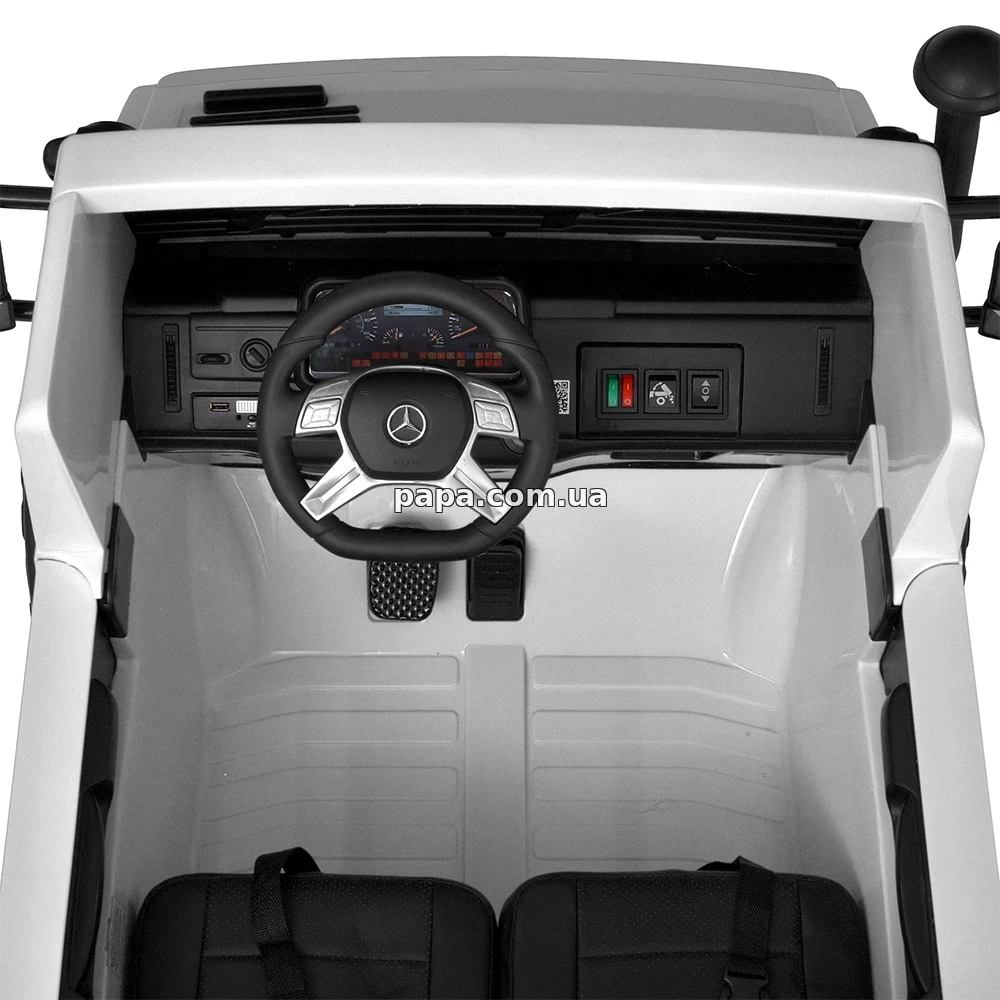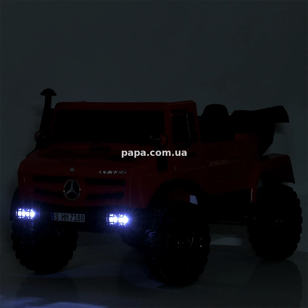 Двухместный детский электромобиль M 5837EBLR-3(36V) красный - выполнен в виде мощного грузовика Mercedes Unimog, который сразу привлекает внимание своим брутальным дизайном и высокой проработкой деталей, все это позволяет малышу почувствовать себя за рулем настоящего автомобиля.