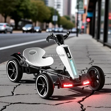 Детский электрокарт M 6277EBR-1 белый имеет комфортное регулируемое сиденье, которое легко подстраивается под рост ребенка, обеспечивая удобную посадку даже при длительном катании, а светящиеся фары и эффектная подсветка корпуса и днища создают особую атмосферу, особенно в вечернее время.