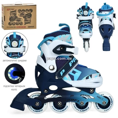 Детские ролики A 4156-S-BL - имеют надежную застежку, которая объединяет шнуровку и баклю, что делает их максимально простыми в использовании и безопасными для ребенка. Колесики расположены в один ряд, изготовлены из прочного полиуретана и обеспечивают плавное скольжение, что особенно важно для новичков. Подсветка колес добавляет азарт и радость во время катания в вечернее время.