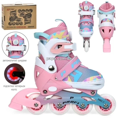 Детские ролики A 4156-S-P - имеют надежную застежку, которая объединяет шнуровку и баклю, что делает их максимально простыми в использовании и безопасными для ребенка. Колесики расположены в один ряд, изготовлены из прочного полиуретана и обеспечивают плавное скольжение, что особенно важно для новичков. Подсветка колес добавляет азарт и радость во время катания в вечернее время.