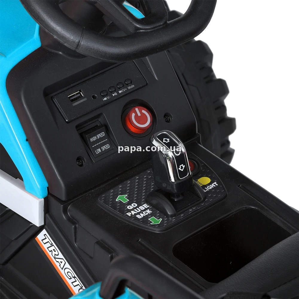 Детский трактор M 5733 EBLR-3 оснащен двумя моторами и работает от аккумулятора, фары светятся, а на передней панели установлена магнитола, что делает поездки еще более интересными и яркими, управлять трактором можно с помощью руля и педали газа, а для самых маленьких предусмотрен пульт, с помощью которого взрослые могут безопасно катать малыша.